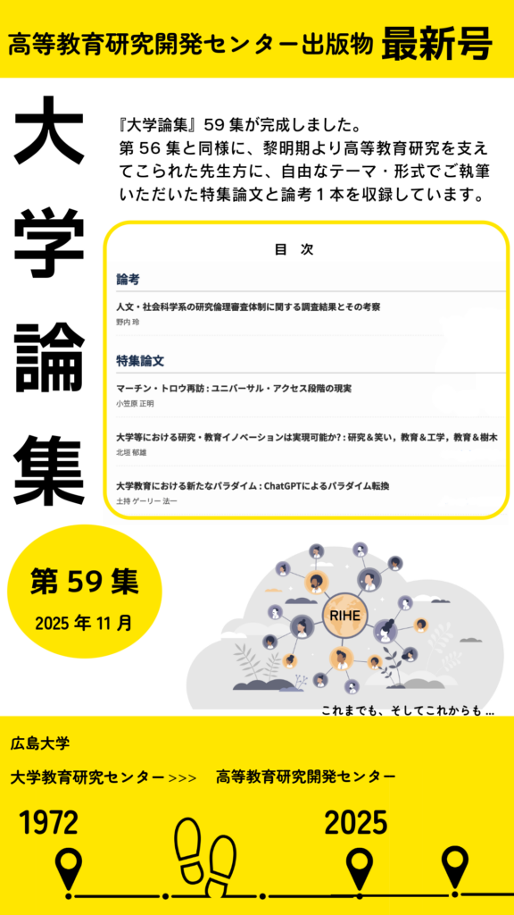 【新刊】大学論集・第59集の刊行について 各論文へのリンク 高等教育研究開発センター出版物サイト『大学論集』にリンク 広島大学学術情報リポジトリ『大学論集』へリンク 関連リンク 高等教育研究開発センターからのお知らせ(本号発行記事) 『大学論集』バックナンバー・刊行物一覧へ 2025年12月10日